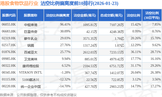从沽空比例偏离度来看,中烟香港、巨星传奇、蒙牛乳业沽空比例偏离度位居行业前三,分别为96.41%、30.09%、29.03%。