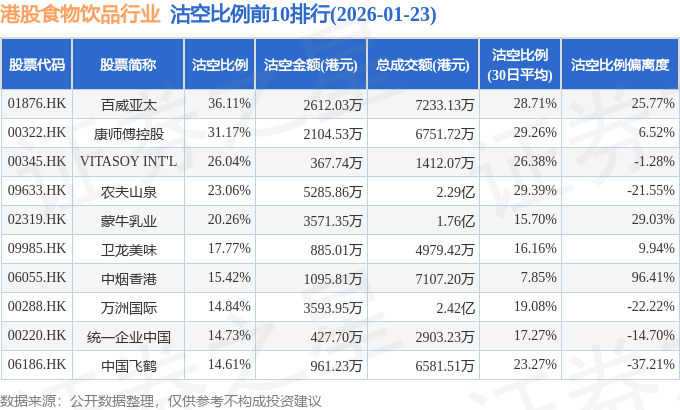 从沽空比例来看,百威亚太、康师傅控股、VITASOY INT'L沽空比例位居行业前三,分别为36.11%、31.17%、26.04%。
