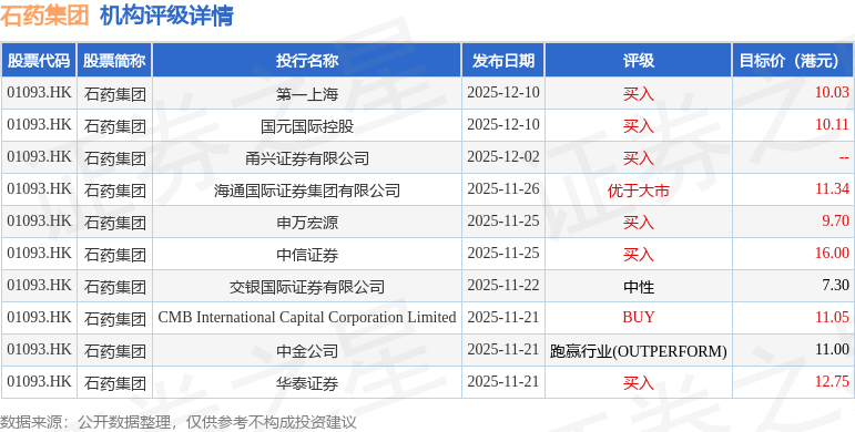 截至2026年1月23日收盘,石药集团(01093.HK)报收于9.81港元,上涨1.34%,成交量7488.1万股,成交额7.31亿港元。投行对该股的评级以买入为主,近90天内共有6家投行给出买入评级,近90天的目标均价为11.03港元。第一上海最新一份研报给予石药集团买入评级,目标价10.03港元。