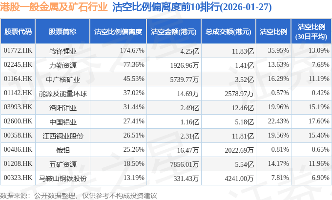 从沽空比例偏离度来看,赣锋锂业、力勤资源、中广核矿业沽空比例偏离度位居行业前三,分别为174.67%、77.36%、45.53%。