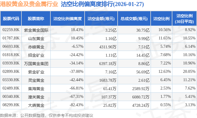 从沽空比例偏离度来看,紫金黄金国际、山东黄金、赤峰黄金沽空比例偏离度位居行业前三,分别为18.43%、10.45%、-6.57%。