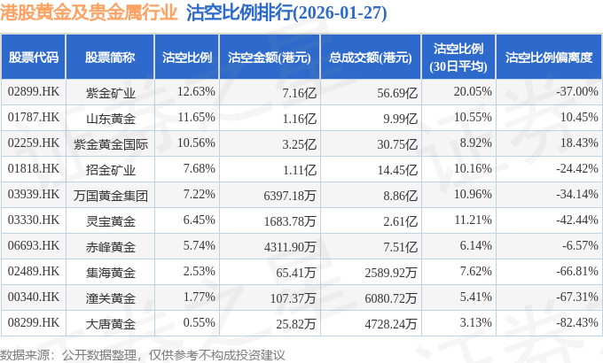 从沽空比例来看,紫金矿业、山东黄金、紫金黄金国际沽空比例位居行业前三,分别为12.63%、11.65%、10.56%。