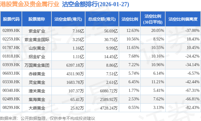 从沽空金额来看,紫金矿业、紫金黄金国际、山东黄金沽空金额位居行业前三,分别为7.16亿港元、3.25亿港元、1.16亿港元。