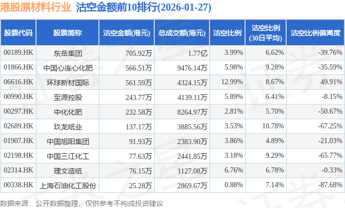 从沽空比例来看,环球新材国际、理文造纸、中国心连心化肥沽空比例位居行业前三,分别为12.99%、6.76%、5.98%。