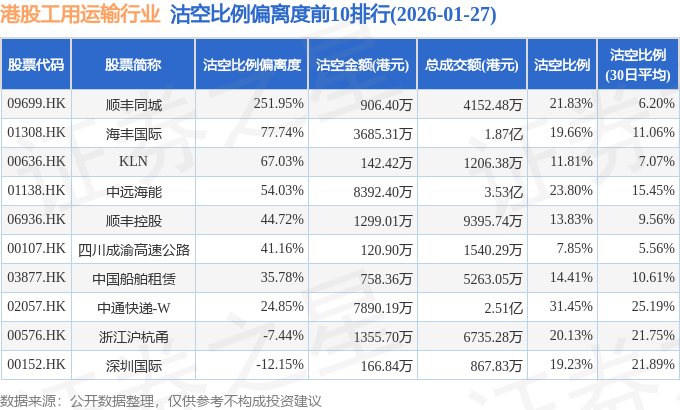 从沽空比例偏离度来看,顺丰同城、海丰国际、KLN沽空比例偏离度位居行业前三,分别为251.95%、77.74%、67.03%。