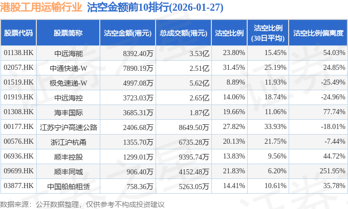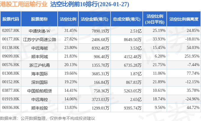 从沽空比例来看,中通快递-W、江苏宁沪高速公路、中远海能沽空比例位居行业前三,分别为31.45%、27.82%、23.8%。
