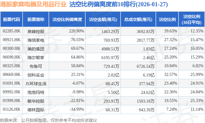 证券之星消息,1月27日港交所披露数据显示,当日港股家庭电器及用品行业的92只个股中有14只被沽空,总沽空股数为1036.39万股,总沽空金额为9.06亿元(港元),而当日家庭电器及用品行业的总成交金额为39.97亿元(港元),沽空比例为22.66%。当日家庭电器及用品行业总体涨0.43%。