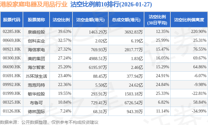 从沽空比例偏离度来看,泉峰控股、海信家电、美的集团沽空比例偏离度位居行业前三,分别为220.9%、76.55%、69.67%。
