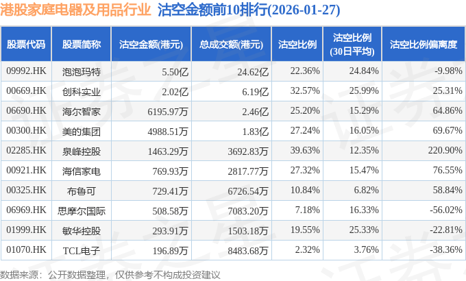 从沽空金额来看,泡泡玛特、创科实业、海尔智家沽空金额位居行业前三,分别为5.5亿港元、2.02亿港元、6195.97万港元。