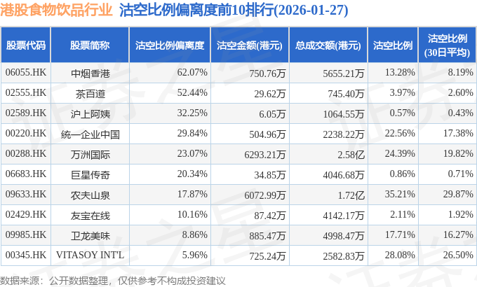 从沽空比例偏离度来看,中烟香港、茶百道、沪上阿姨沽空比例偏离度位居行业前三,分别为62.07%、52.44%、32.25%。