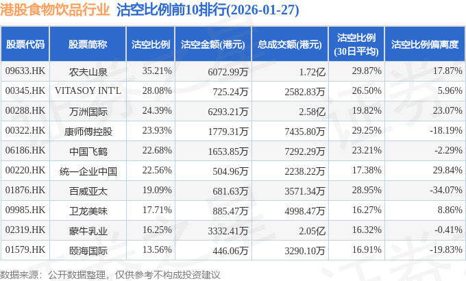 从沽空比例来看,农夫山泉、VITASOY INT'L、万洲国际沽空比例位居行业前三,分别为35.21%、28.08%、24.39%。