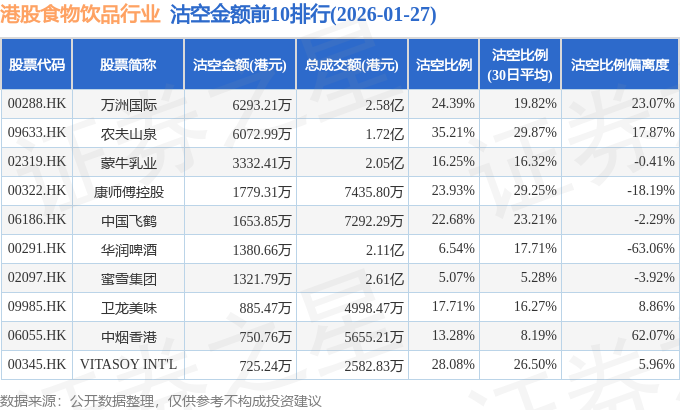从沽空金额来看,万洲国际、农夫山泉、蒙牛乳业沽空金额位居行业前三,分别为6293.21万港元、6072.99万港元、3332.41万港元。