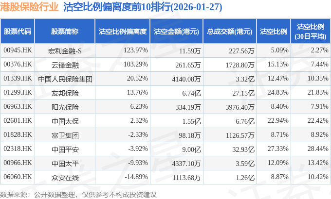 从沽空比例偏离度来看,宏利金融-S、云锋金融、中国人民保险集团沽空比例偏离度位居行业前三,分别为123.97%、103.29%、20.52%。
