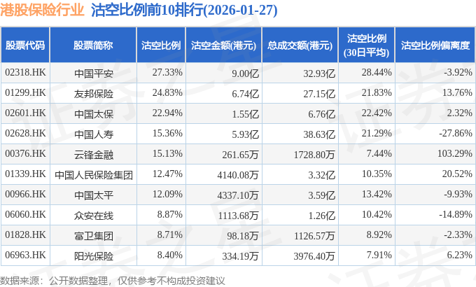 从沽空比例来看,中国平安、友邦保险、中国太保沽空比例位居行业前三,分别为27.33%、24.83%、22.94%。