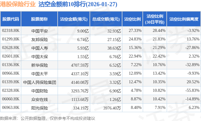 从沽空金额来看,中国平安、友邦保险、中国人寿沽空金额位居行业前三,分别为9亿港元、6.74亿港元、5.93亿港元。