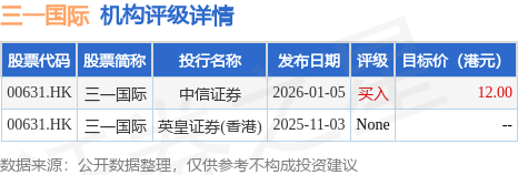 投行对该股的评级以买入为主,近90天内共有1家投行给出买入评级,近90天的目标均价为12港元。中信证券最新一份研报给予三一国际买入评级,目标价12港元。