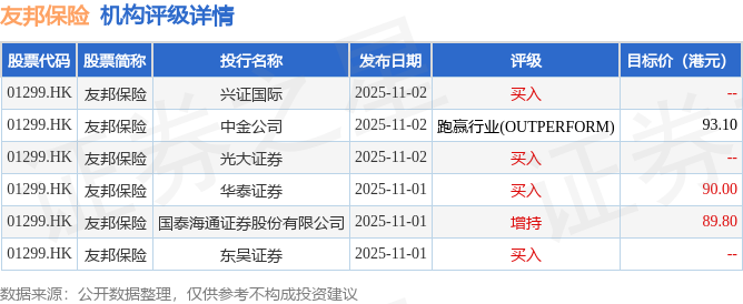 截至2026年1月28日收盘,友邦保险(01299.HK)报收于88.85港元,上涨2.78%,成交量3771.62万股,成交额33.25亿港元。投行对该股的评级以买入为主,近90天内共有4家投行给出买入评级,近90天的目标均价为90.97港元。兴证国际最新一份研报给予友邦保险买入评级。
