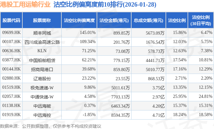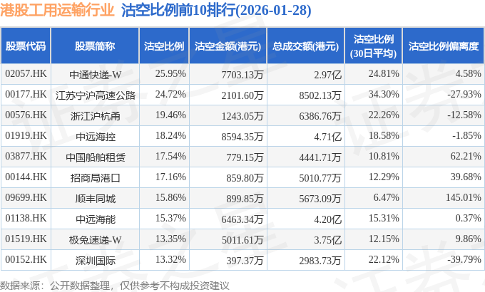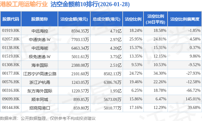 从沽空金额来看,中远海控、中通快递-W、中远海能沽空金额位居行业前三,分别为8594.35万港元、7703.13万港元、6463.34万港元。