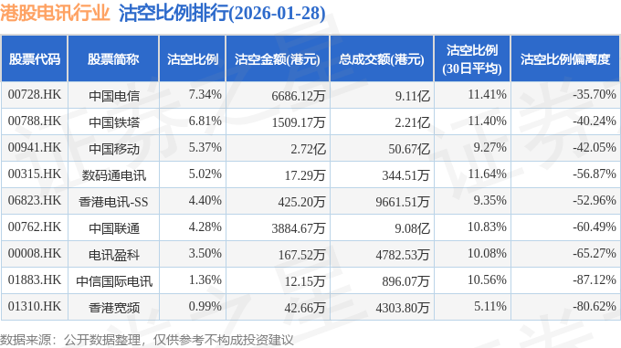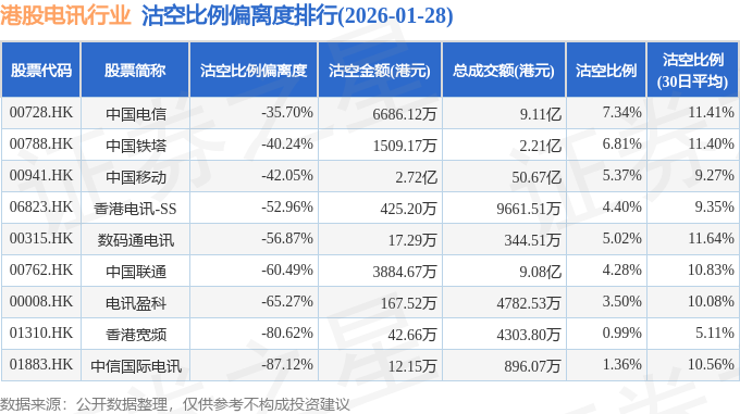 从沽空比例来看,中国电信、中国铁塔、中国移动沽空比例位居行业前三,分别为7.34%、6.81%、5.37%。