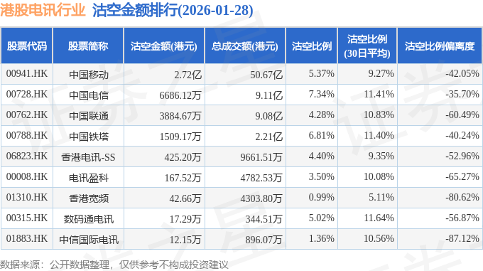 从沽空金额来看,中国移动、中国电信、中国联通沽空金额位居行业前三,分别为2.72亿港元、6686.12万港元、3884.67万港元。