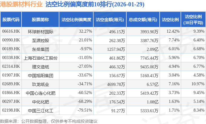 从沽空比例偏离度来看,环球新材国际、至源控股、东岳集团沽空比例偏离度位居行业前三,分别为32.27%、21.01%、-9.97%。