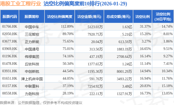 从沽空比例偏离度来看,中国中车、三花智控、正力新能沽空比例偏离度位居行业前三,分别为112.89%、89.7%、75.65%。