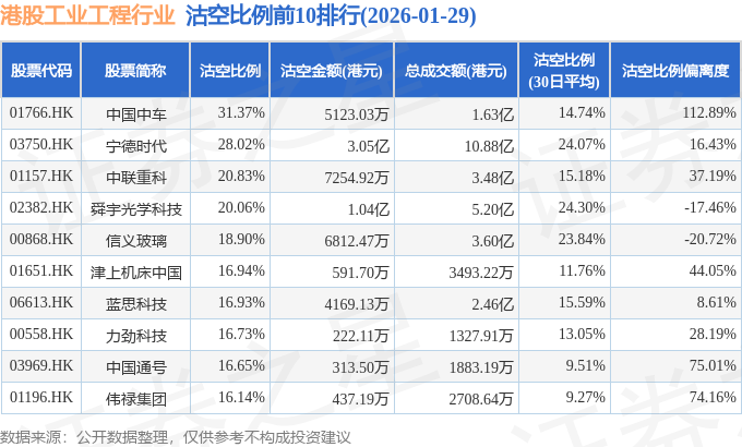 证券之星消息,1月29日港交所披露数据显示,当日港股工业工程行业的216只个股中有55只被沽空,总沽空股数为1.13亿股,总沽空金额为11.71亿元(港元),而当日工业工程行业的总成交金额为101.42亿元(港元),沽空比例为11.55%。当日工业工程行业总体跌0.93%。