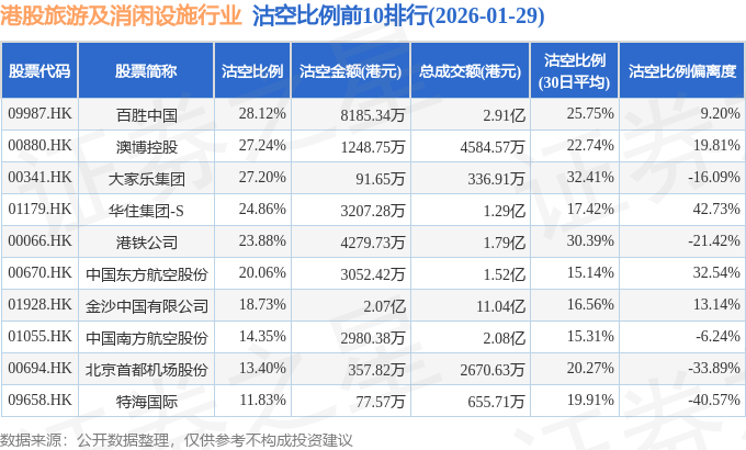 从沽空比例来看,百胜中国、澳博控股、大家乐集团沽空比例位居行业前三,分别为28.12%、27.24%、27.2%。