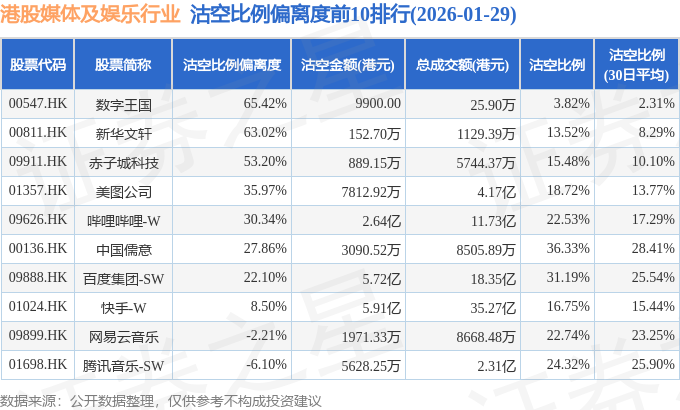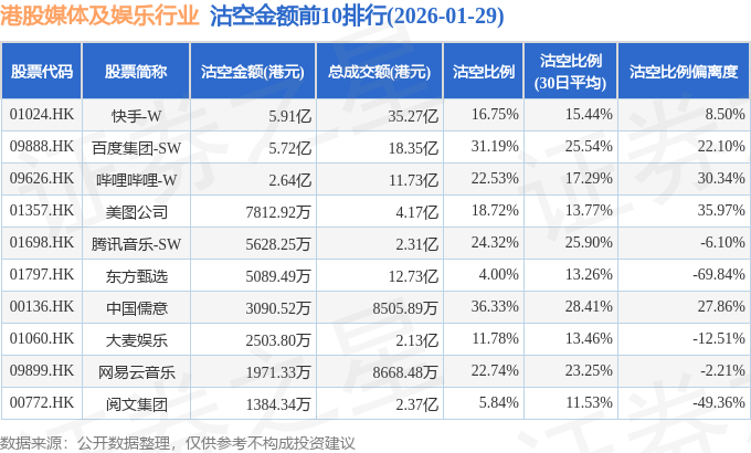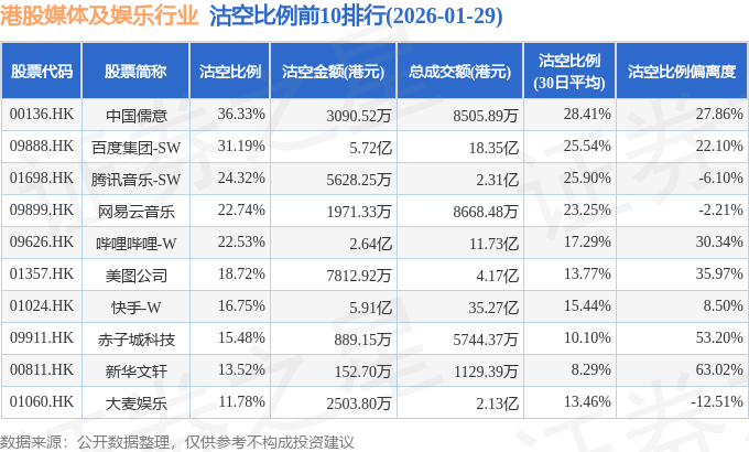 从沽空比例来看,中国儒意、百度集团-SW、腾讯音乐-SW沽空比例位居行业前三,分别为36.33%、31.19%、24.32%。