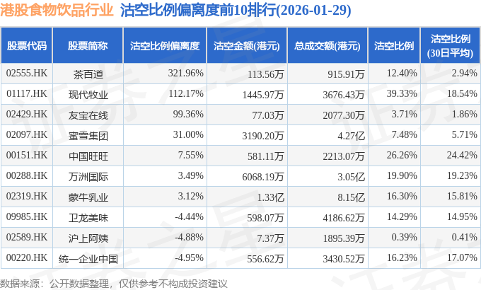 从沽空比例偏离度来看,茶百道、现代牧业、友宝在线沽空比例偏离度位居行业前三,分别为321.96%、112.17%、99.36%。