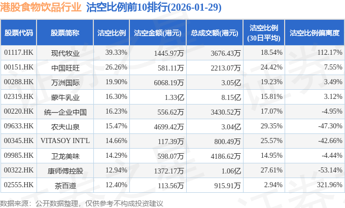 从沽空比例来看,现代牧业、中国旺旺、万洲国际沽空比例位居行业前三,分别为39.33%、26.26%、19.9%。