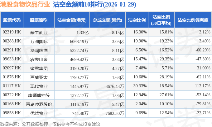 从沽空金额来看,蒙牛乳业、万洲国际、华润啤酒沽空金额位居行业前三,分别为1.33亿港元、6068.19万港元、5322.74万港元。