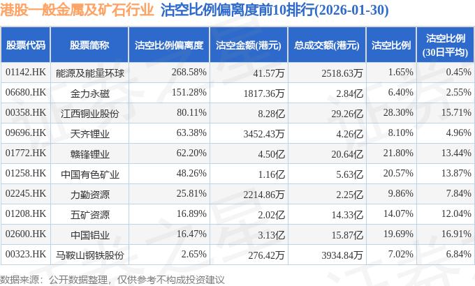 从沽空比例偏离度来看,能源及能量环球、金力永磁、江西铜业股份沽空比例偏离度位居行业前三,分别为268.58%、151.28%、80.11%。