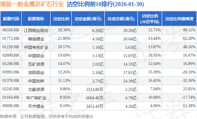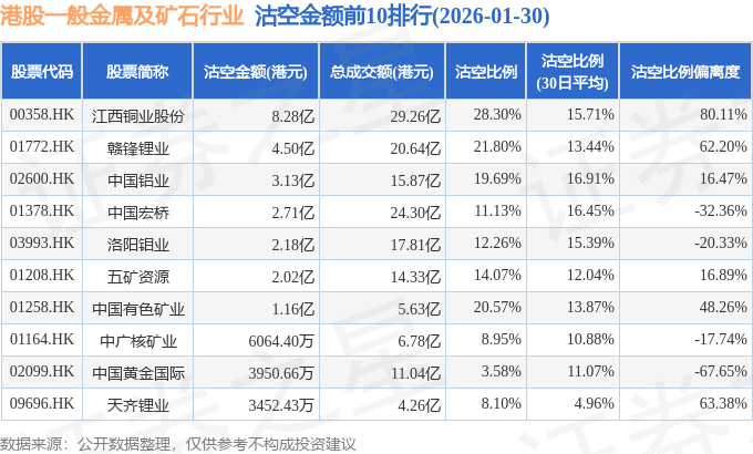 从沽空金额来看,江西铜业股份、赣锋锂业、中国铝业沽空金额位居行业前三,分别为8.28亿港元、4.5亿港元、3.13亿港元。