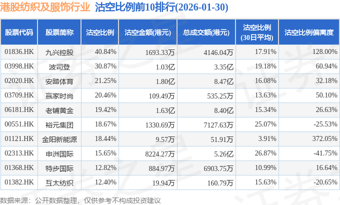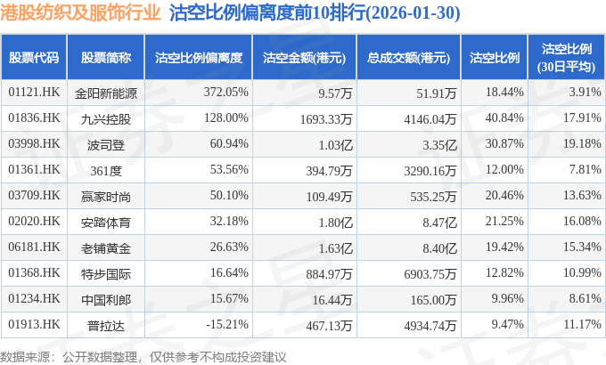 从沽空比例偏离度来看,金阳新能源、九兴控股、波司登沽空比例偏离度位居行业前三,分别为372.05%、128%、60.94%。