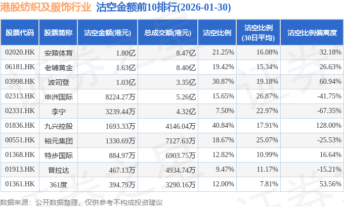 从沽空金额来看,安踏体育、老铺黄金、波司登沽空金额位居行业前三,分别为1.8亿港元、1.63亿港元、1.03亿港元。