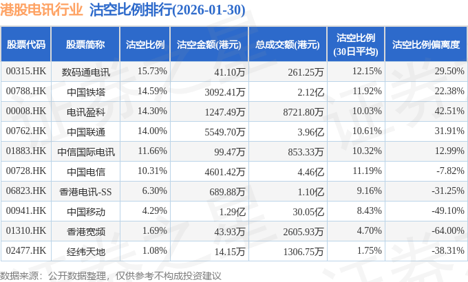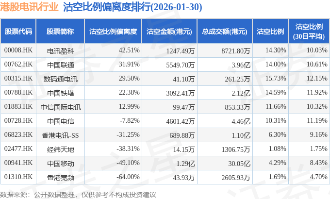 从沽空比例偏离度来看,电讯盈科、中国联通、数码通电讯沽空比例偏离度位居行业前三,分别为42.51%、31.91%、29.5%。