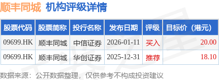 投行对该股的评级以推荐为主,近90天内共有1家投行给出推荐评级,近90天的目标均价为19.05港元。中信证券最新一份研报给予顺丰同城买入评级,目标价20港元。