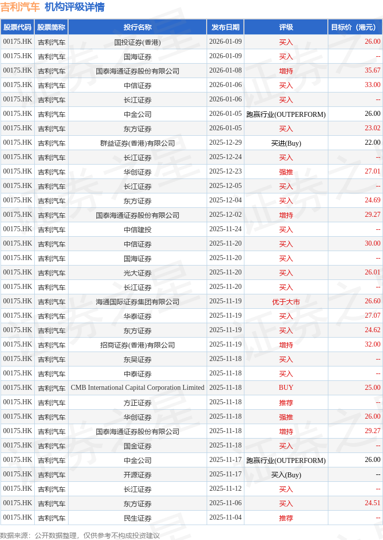 投行对该股的评级以买入为主,近90天内共有20家投行给出买入评级,近90天的目标均价为27.19港元。国投证券(香港)最新一份研报给予吉利汽车买入评级,目标价26港元。