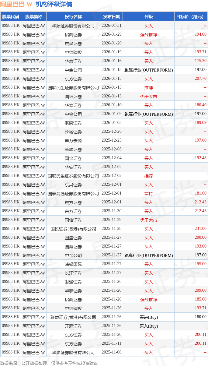 投行对该股的评级以买入为主,近90天内共有26家投行给出买入评级,近90天的目标均价为196.89港元。华源证券股份有限公司最新一份研报给予阿里巴巴-W买入评级。