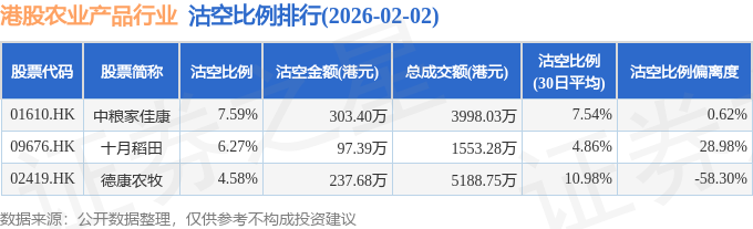 证券之星消息,2月2日港交所披露数据显示,当日港股农业产品行业的21只个股中有3只被沽空,总沽空股数为199.65万股,总沽空金额为638.47万元(港元),而当日农业产品行业的总成交金额为1.11亿元(港元),沽空比例为5.75%。当日农业产品行业总体跌0.95%。