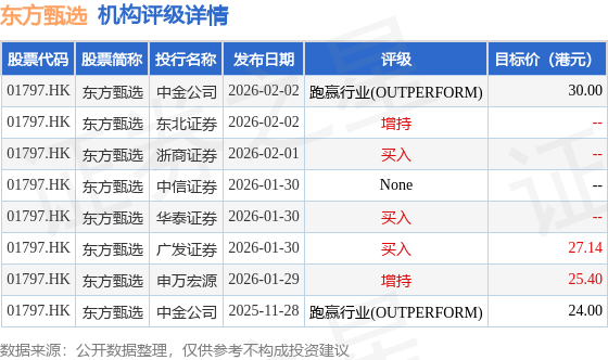 投行对该股的评级以买入为主,近90天内共有3家投行给出买入评级,近90天的目标均价为26.64港元。中金公司最新一份研报给予东方甄选跑赢行业(OUTPERFORM)评级,目标价30港元。
