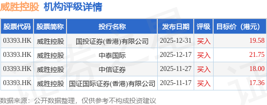 投行对该股的评级以买入为主,近90天内共有4家投行给出买入评级,近90天的目标均价为19.17港元。国投证券(香港)有限公司最新一份研报给予威胜控股买入评级,目标价19.58港元。