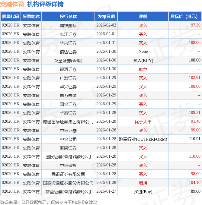 投行对该股的评级以买入为主,近90天内共有40家投行给出买入评级,近90天的目标均价为105.06港元。浦银国际最新一份研报给予安踏体育买入评级,目标价97.3港元。