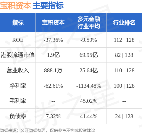 宝积资本港股市值1.9亿港元,在多元金融行业中排名第82。主要指标见下表:
