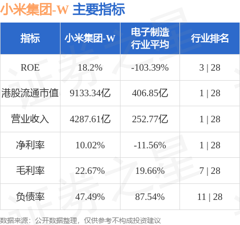 小米集团-W港股市值9133.34亿港元,在电子制造行业中排名第1。主要指标见下表: