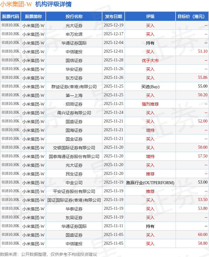 截至2026年2月3日收盘,小米集团-W(01810.HK)报收于34.6港元,下跌1.31%,成交量1.42亿股,成交额49.25亿港元。投行对该股的评级以买入为主,近90天内共有16家投行给出买入评级,近90天的目标均价为54.23港元。光大证券最新一份研报给予小米集团-W买入评级。