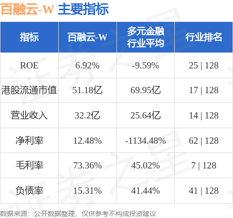 百融云-W港股市值51.18亿港元,在多元金融行业中排名第17。主要指标见下表: