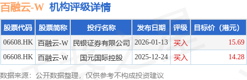截至2026年2月3日收盘,百融云-W(06608.HK)报收于11.7港元,上涨4.46%,成交量269.25万股,成交额3068.43万港元。投行对该股的评级以买入为主,近90天内共有2家投行给出买入评级,近90天的目标均价为14.98港元。民银证券有限公司最新一份研报给予百融云-W买入评级,目标价15.69港元。