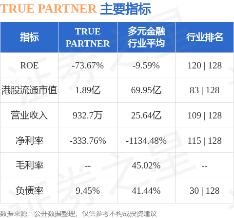 TRUE PARTNER港股市值1.89亿港元,在多元金融行业中排名第83。主要指标见下表: